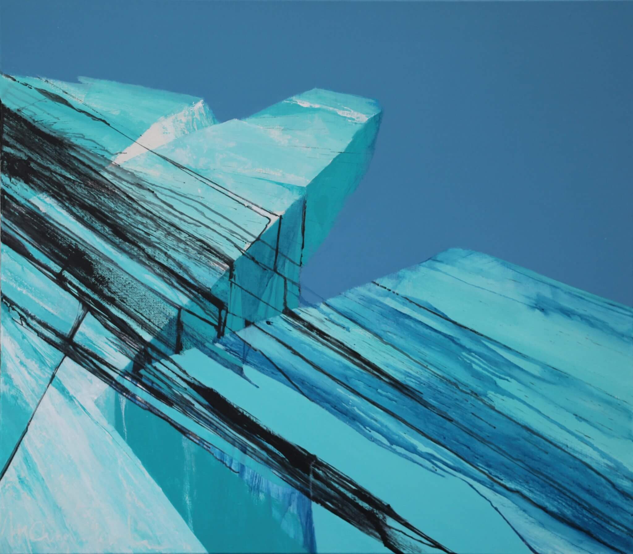 The main inspiration for the ‘Glass Mountains’ series was a piece of selenite brought from Tunisia revealing a translucent, crystalline structure with clear layers and a linear pattern. In my paintings, this small piece of rock that could be held in the palm of one hand became a huge glass platform, a giant slab with numerous fractures and patches of discoloration.