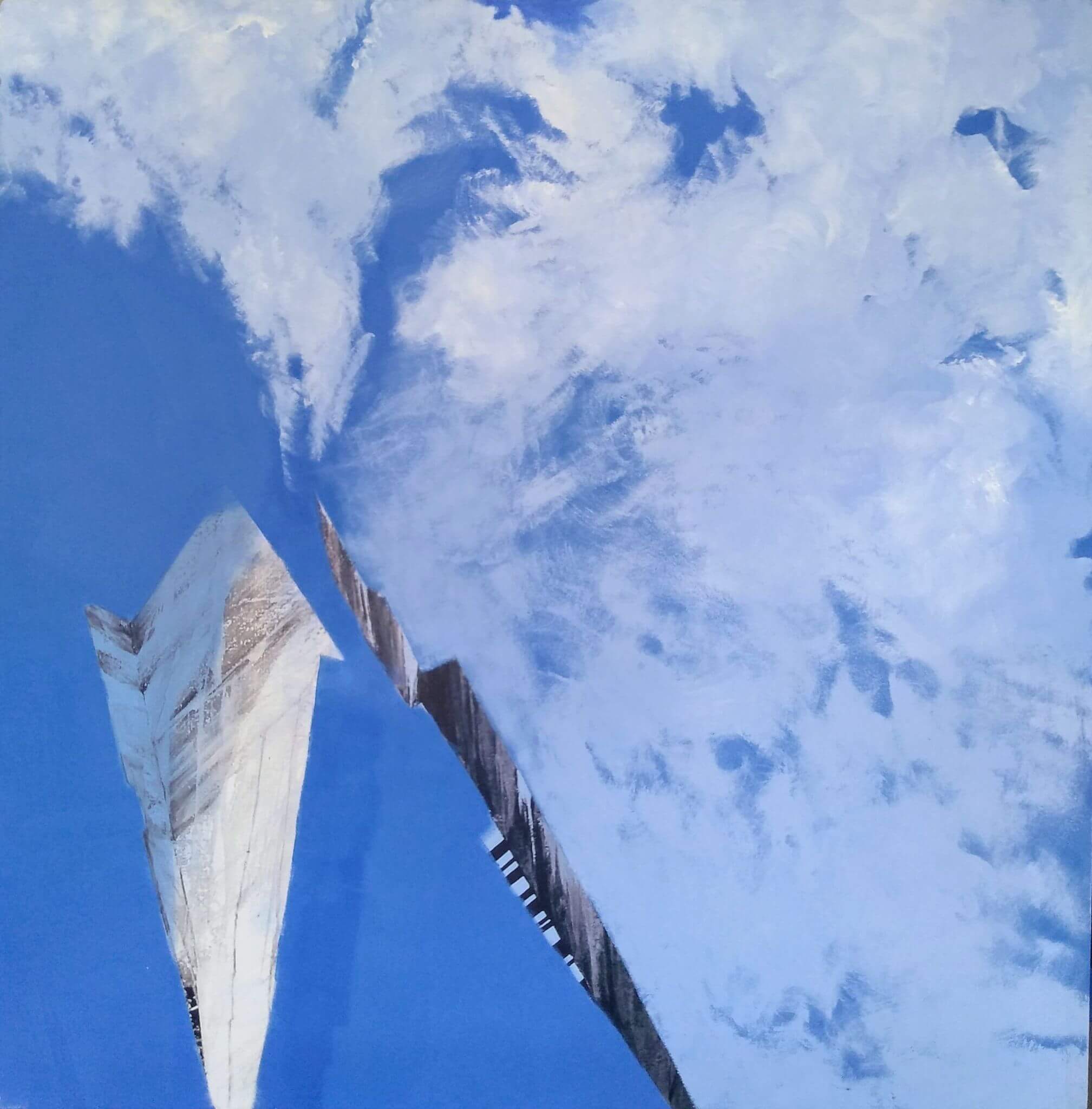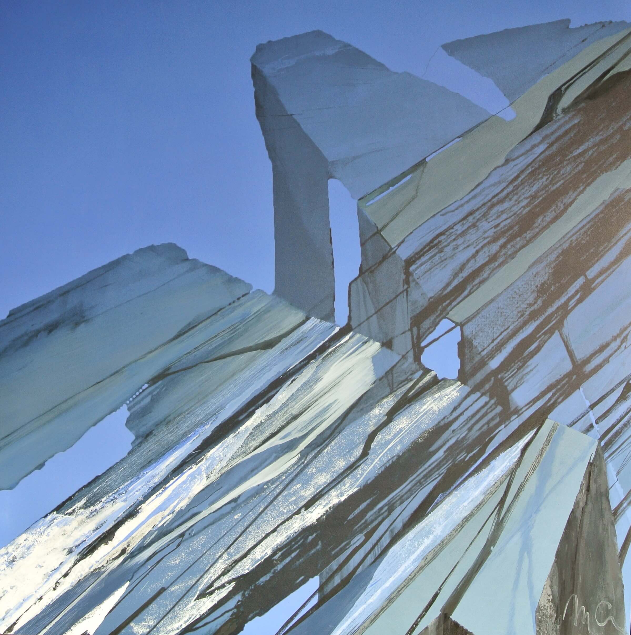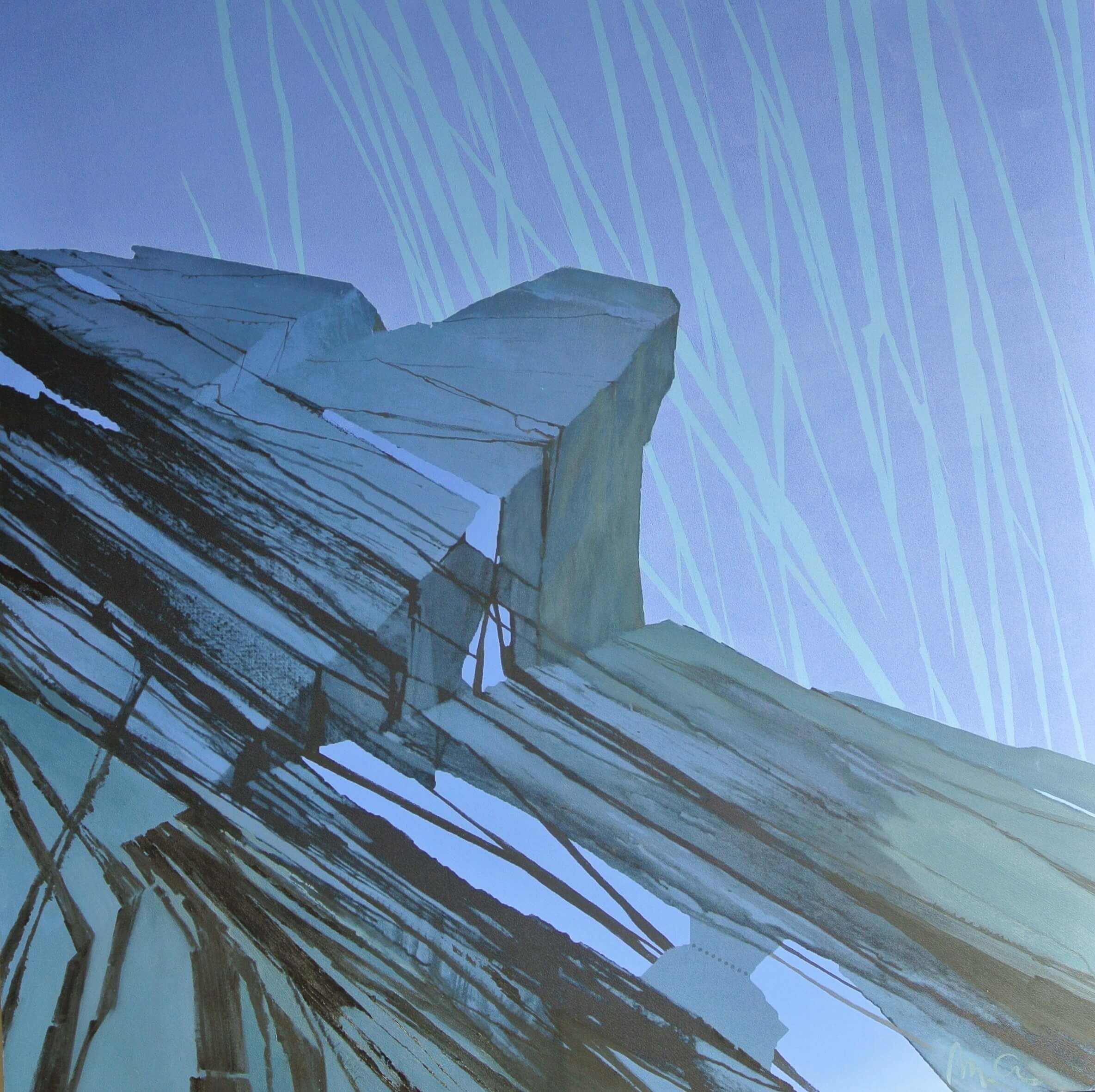 Mix malarstwa olejnego i druku cyfrowego na płytach polistyrenowych. Przedstawione skały to fragmenty potężnych bloków skalnych wpisanych w przestrzeń błękitu. Skaliste formy na obrazach są często niekompletne, niedokończone, ucięte i ułożone diagonalnie. Kompozycje sugerują chęć wyjścia poza ramy, kojarzą się z chęcią uwolnienia – wyjścia z układu przestrzennego.